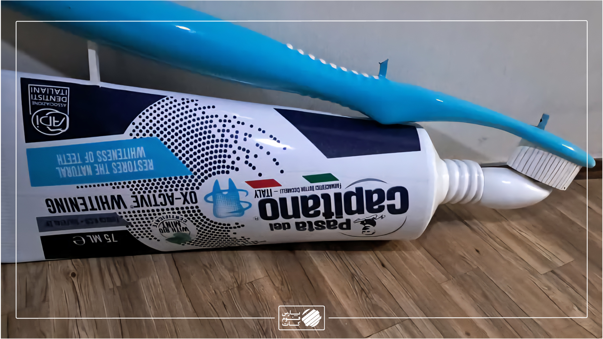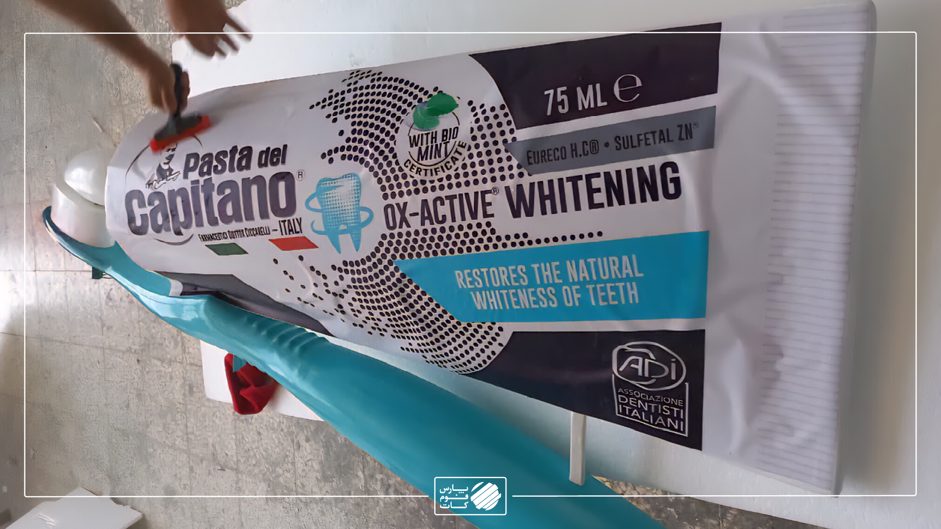 ماکت مسواک و خمیردندان با طول ۱.۵ متر از فوم فشرده ساخته شده و پس از پرداخت دقیق سطح، با پوشش پلیمری و رنگ خودرویی اجرا گردید.