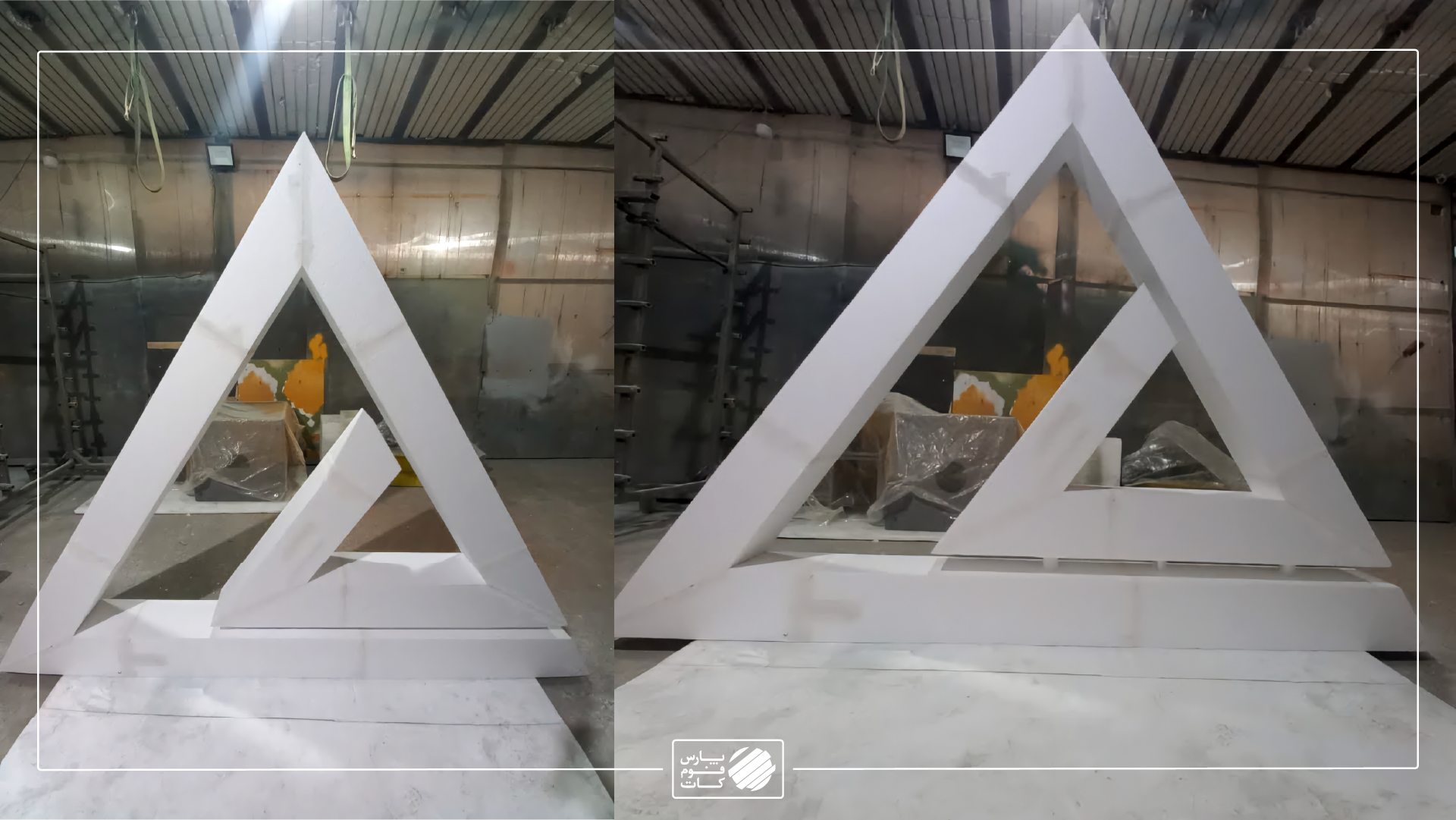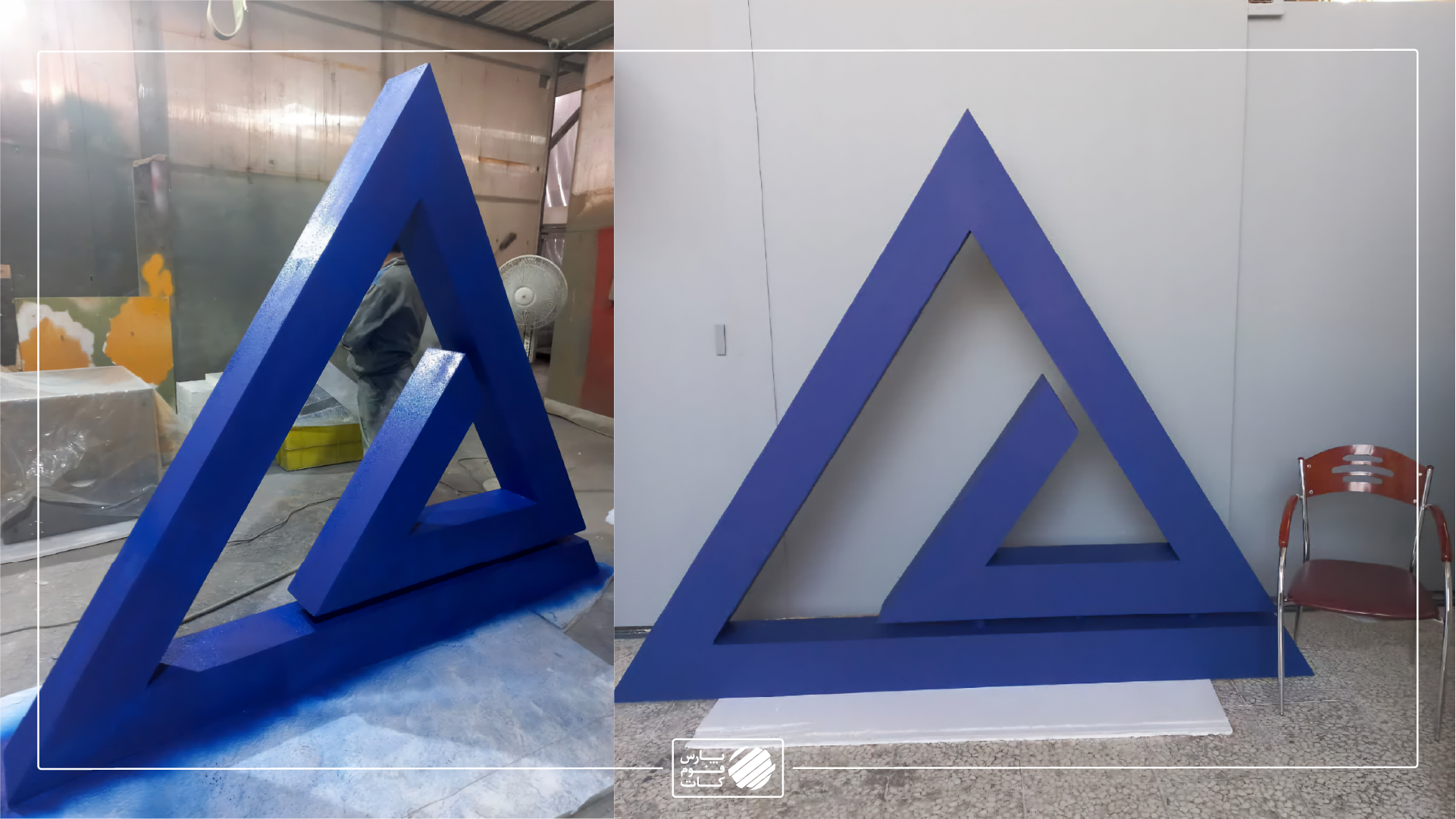 لوگو ابتدا با توجه به فایل طراحی اصلی بازسازی سهبعدی شد تا تمامی زوایا و تناسبات برند بدون خطا به فرم حجمی تبدیل گردد. سپس فرم نهایی با فوم پلیاستایرن و دستگاه CNC ساخته شد تا مدل خروجی از نظر اندازه، تقارن و تمیزی لبهها کاملاً مطابق با طراحی گرافیکی باشد.